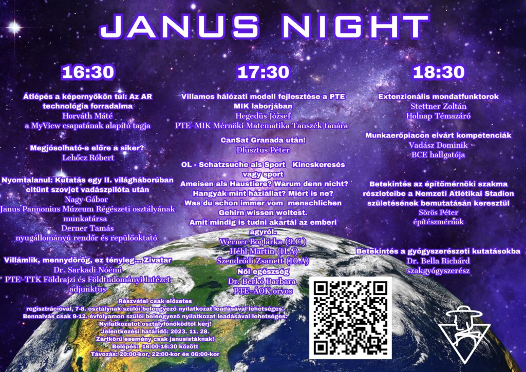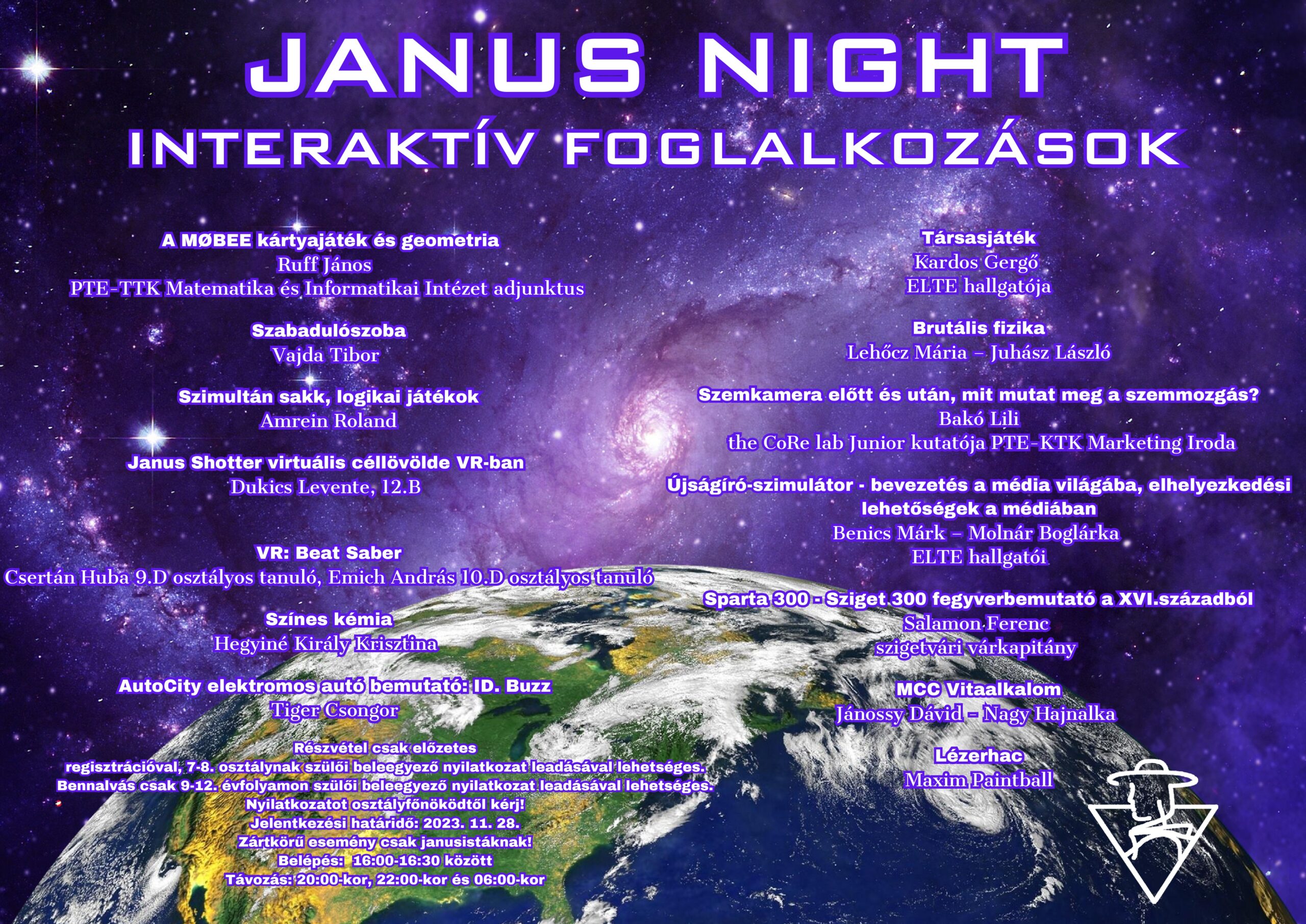 December 1-én, ahogy minden évben, idén is megrendezésre került a Janus Night. Ez a rendezvény minden janusista számára egy fontos esemény. A diákok izgatottan várták a program fő részét, és az idén hosszú idő után először megrendezésre került bentalvást is. A 11 előadásból, majd 13 interaktív foglalkozásból álló első részen több mint 300-an, míg az éjszakai órákban 130 körüli volt a résztvevők száma. Mivel diákönkormányzatunk arra törekszik, hogy a diákság érdekeit előtérbe helyezze, idén nemcsak a megszokott témákban zajlottak előadások, és nemcsak a közönség kedvencei tértek vissza előadni – mint például Holnap Témazáró Youtube-csatorna tulajdonosa, Stettner Zoli – hanem női egészségről szóló előadásra is sor került, és lehetőséget biztosítottunk tehetséges diáktársaink német nyelvű előadásaira is. Az első részben – 16:30 – 19:15 óra között – három idősávban, sávonként négy előadás várta az érdeklődő diákokat. Több előadó érkezett innen az iskolából, de több előadót hívott az iskolavezetés és a DÖK is. Az előadásokat követően a diákok interaktív foglalkozásokon vettek részt 19:30 és 22:00 között. Ezek között szerepeltek régi, de még mindig látványos kísérletek Hegyiné Király Krisztina tanárnőtől, a már törzsvendég AutoCity (akiknek az idei autója éppen hogy befért az udvarra), régi és új VR-os programok, egy pécsi fejlesztésű készségfejlesztő társasjáték bemutatása és kipróbálásának lehetősége, Vajda Tibor tanár úr különleges szabadulószobája, és több volt diákjaink által tartott workshop is. Az előadóknak egy kis ajándékkal – bor vagy csokoládé – köszöntük meg a részvételt.