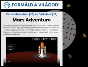 A 3D és Innováció szakkör tagjaiként (Béri Márk és Verno Massimo 12. B osztályos tanulók) részt vettünk a C3 alapítvány “Formáld a világod!” versenyén, ahol országos 7. helyezést értünk el (a végső helyezést a TOP 10-en belül az életkor alapján döntötték el). A versenyre 19 évnél fiatalabb jelentkezők adhatták le projektmunkájukat, amely lehetett szoftvertől elkezdve, filmen át egész keretrendszerekig. A budapesti döntőn 10 projekt vett részt, köztük a mi projektünk, a “Mars Adventure”. Az esemény egy workshop programmal kezdődött, ahol például tanulhattunk a 3D nyomtatás hétköznapi alkalmazásairól. Ezután következett a díjátadó, ahol bemutatták a csapatok munkáit és a zsűri véleményét is ismertették, illetve a csapattagoknak tettek fel a projektekkel kapcsolatos kérdéseket. Emellett külföldi versenyzők is tartottak előadást. Ezután egy kiállítás keretein belül minden csapat pályázatait meg lehetett tekinteni, ki lehetett próbálni.