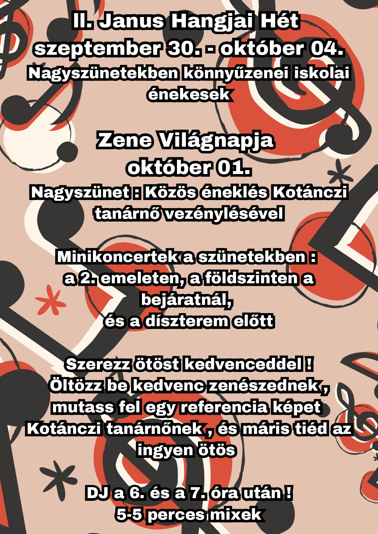 A II. Janus hangjai hetében könnyűzenei fellépőket hallgathatunk a nagyszünetekben. Október 1-jén, a Zene világnapján a szünetekben emeletkoncerteken hangszeres előadók lépnek fel, a nagyszünetben az iskola diák- és tanári közösségét várjuk az udvaron közös éneklésre.