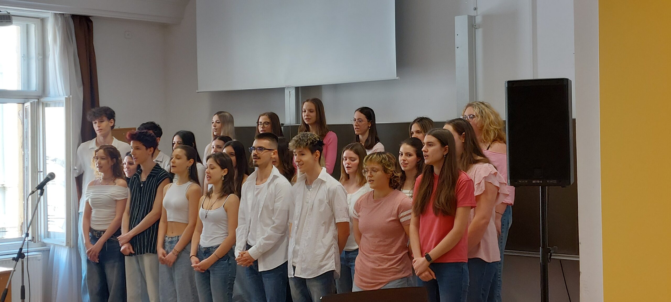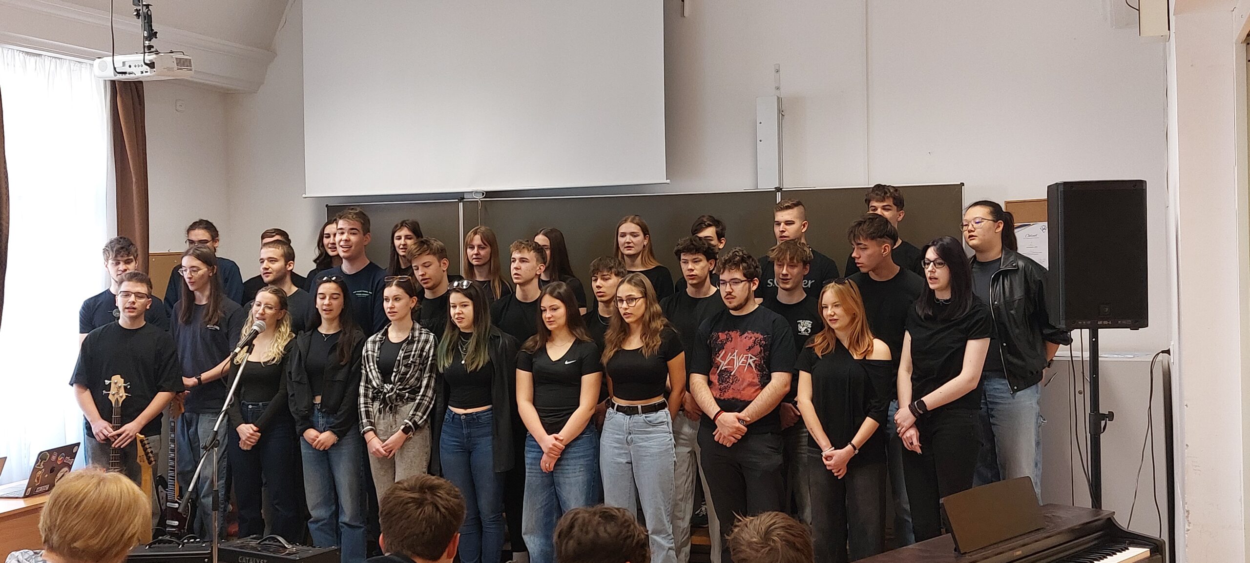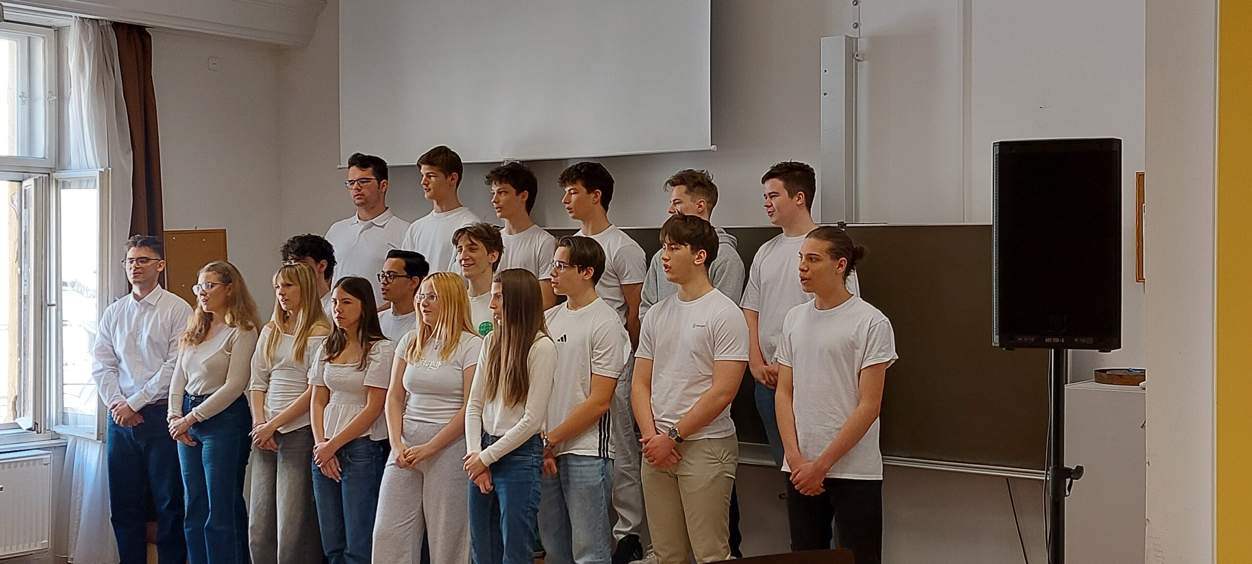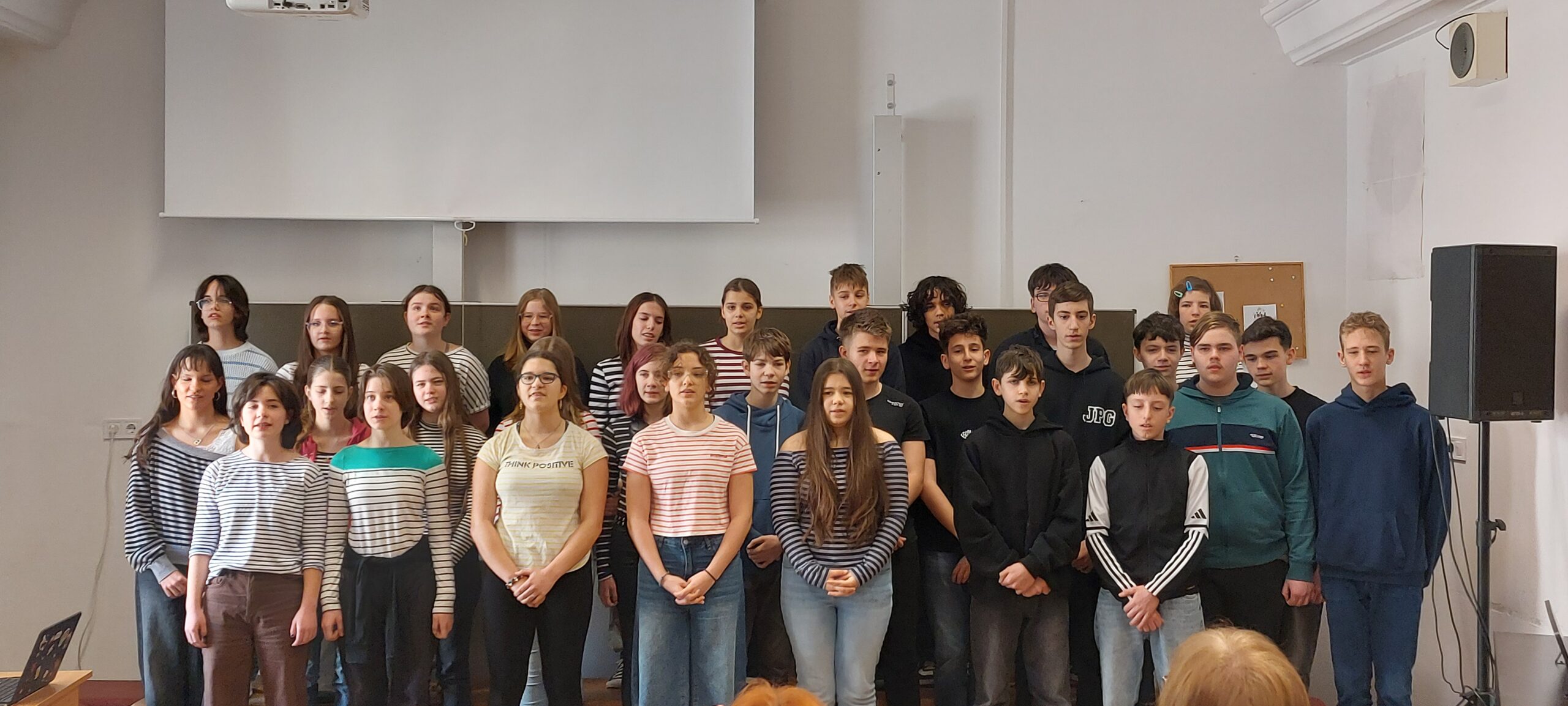 Március 11-én ismét felcsendült az ének a Dísztermünkben. Az immár hagyományos rendezvényünkön az osztályaink egy-egy népdalcsokrot és egy szabadon választott dalt mutattak be. A közös éneklés örömét  többen hangszeres kísérettel és kreatív koreográfiával fokozták. A Dr. Kurucz Réka és Harmat Zóra tanárnők alkotta zsűri a produkciók értékelésén túl tanácsokat is adott a következő évi felkészüléshez.